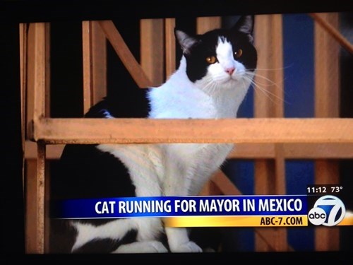 Esse gato já é candidato a prefeito no mexico, e você ai tentando decidir se vende sua casa para comprar o PS4.